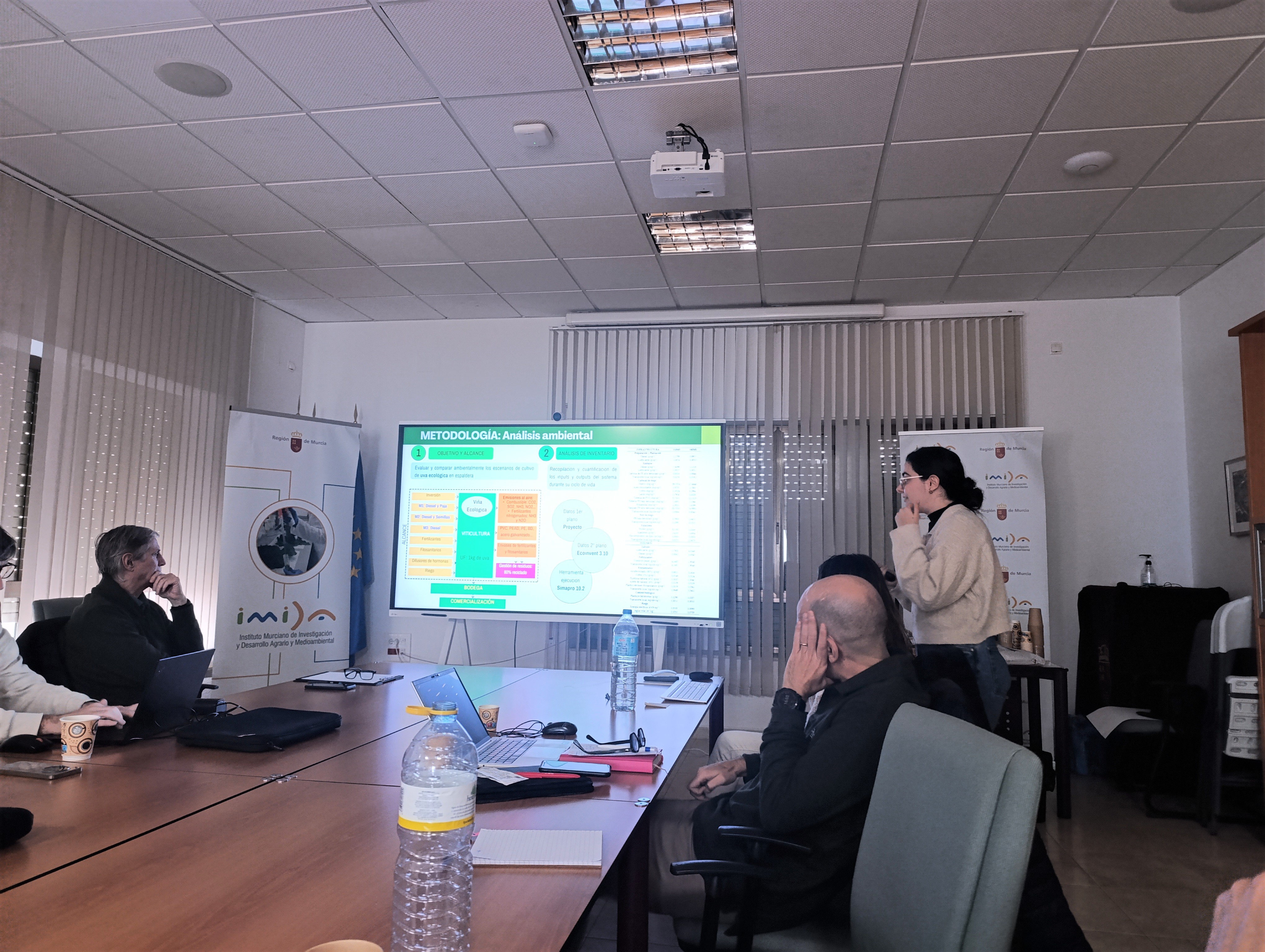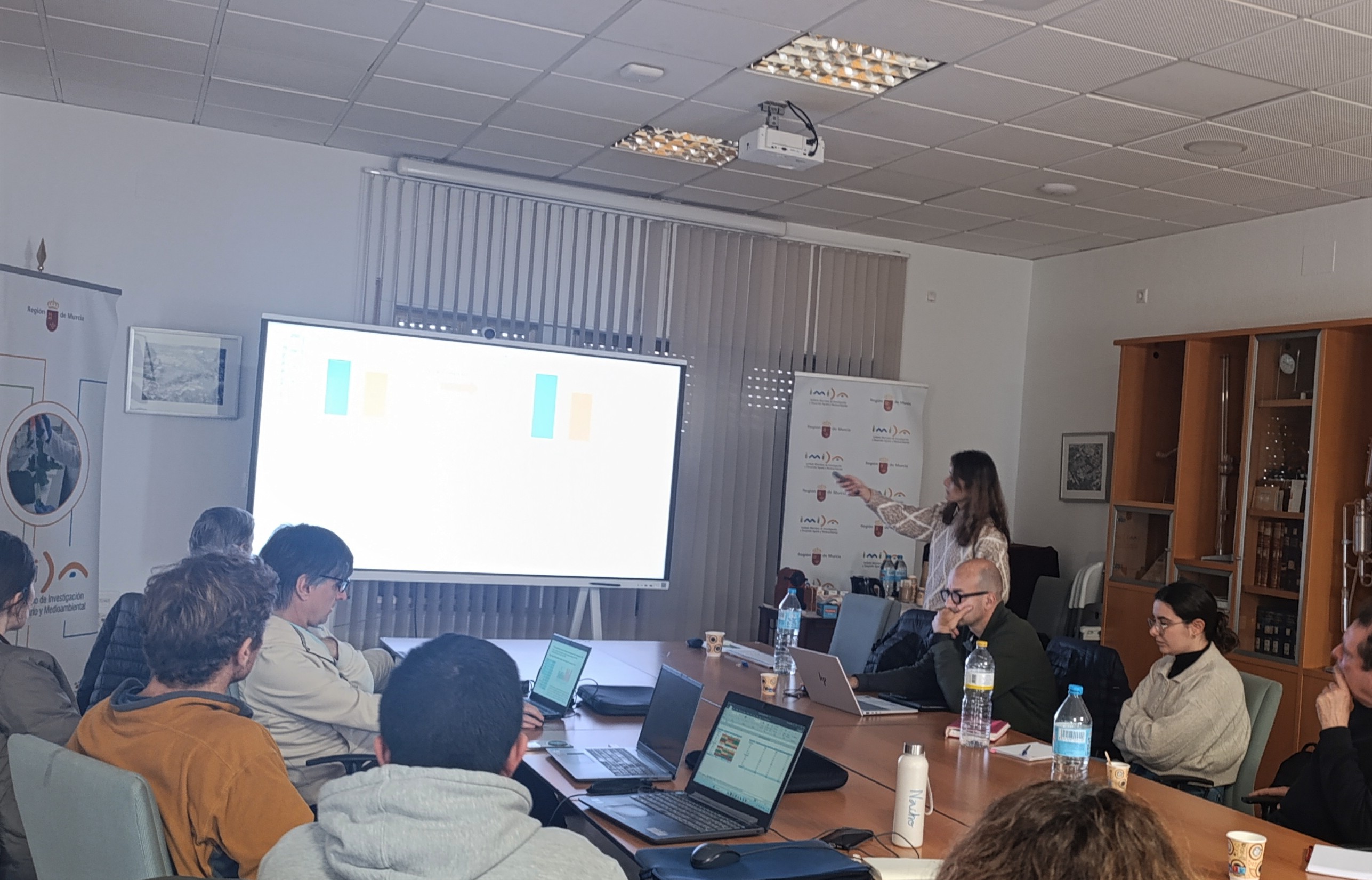 Por parte del IMIDA intervinieron Pascual Romero y Elisa Morote, que presentaron los resultados más recientes relacionados con la interacción entre genotipo, riego deficitario y manejo sostenible del suelo; Josefa Mª Navarro, que expuso los progresos sobre material vegetal y micorrización; y José García y Begoña García, encargados del análisis económico y de ciclo de vida de las estrategias evaluadas. También participó el investigador Pablo Botía, que colabora en distintas actividades del proyecto.