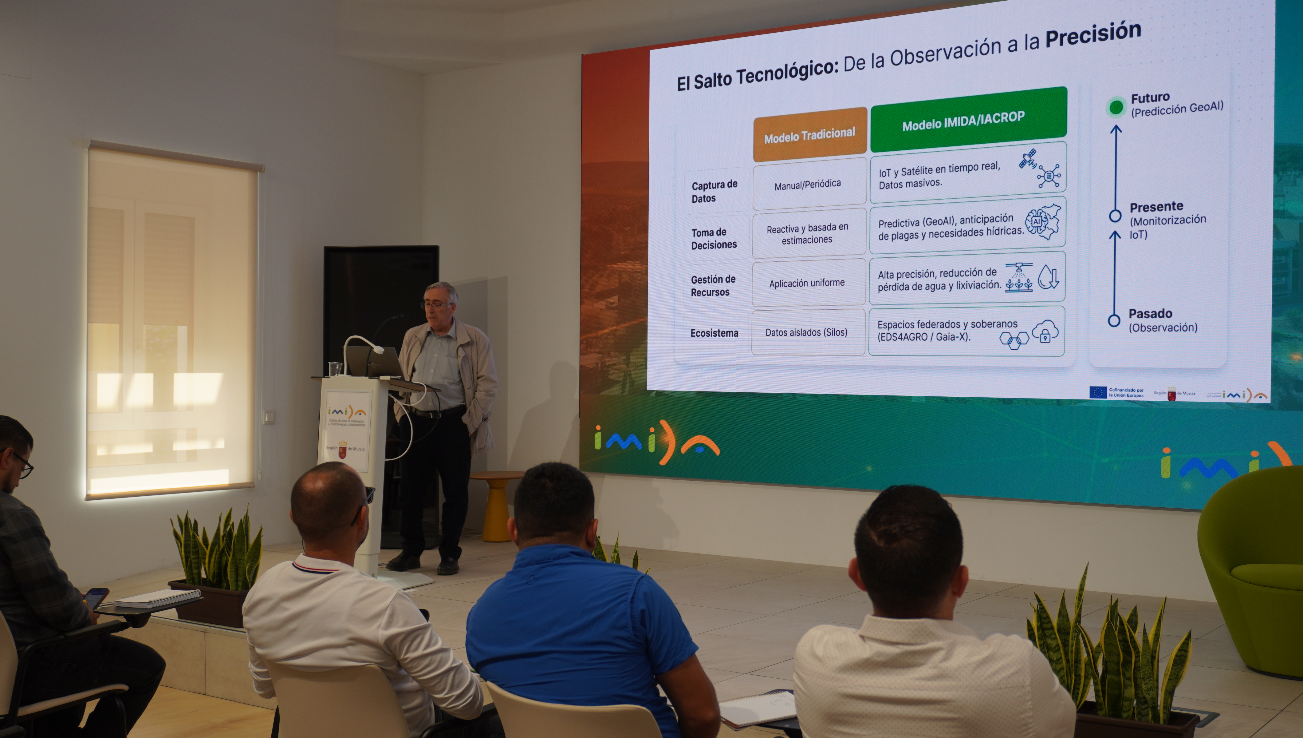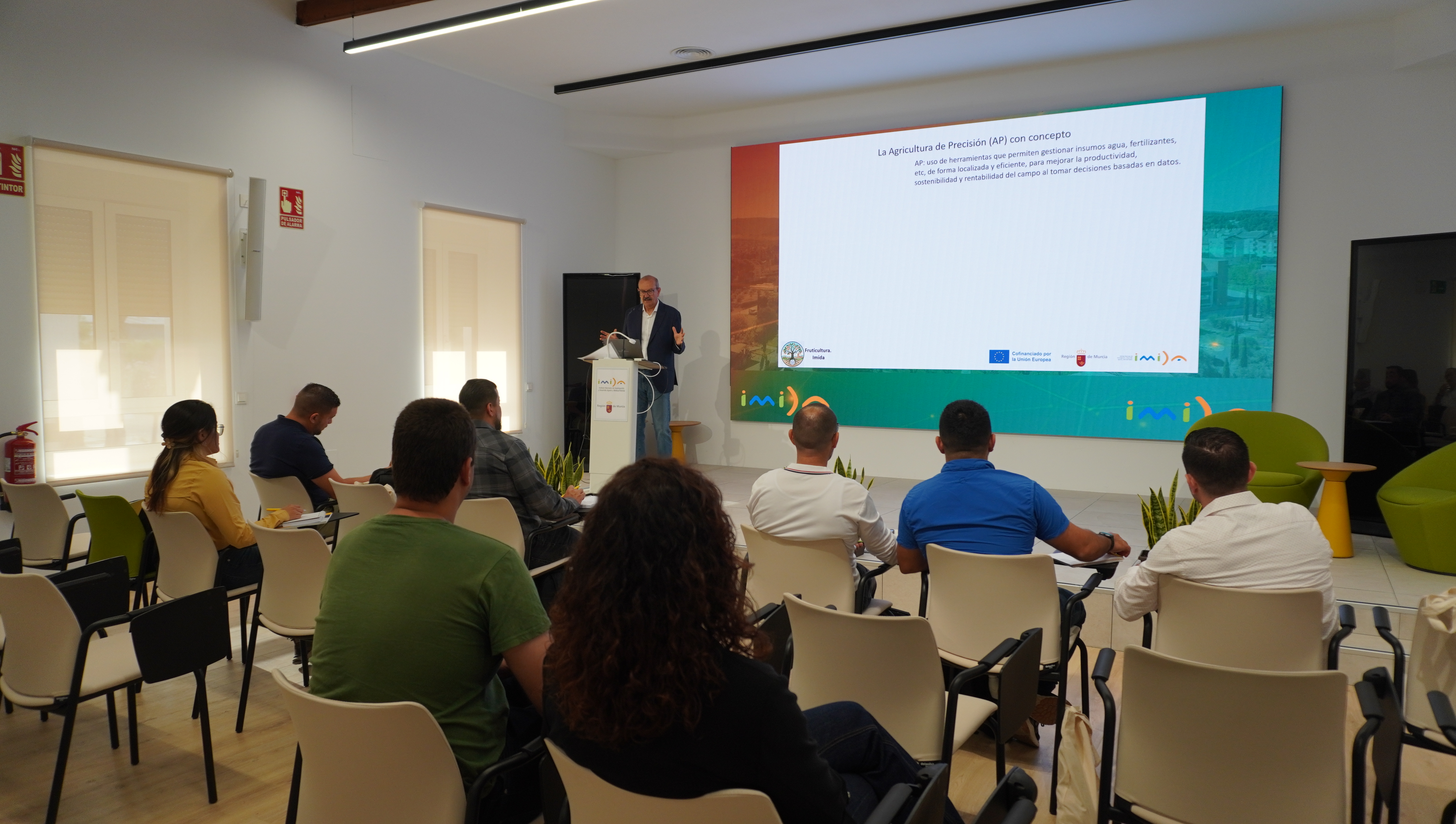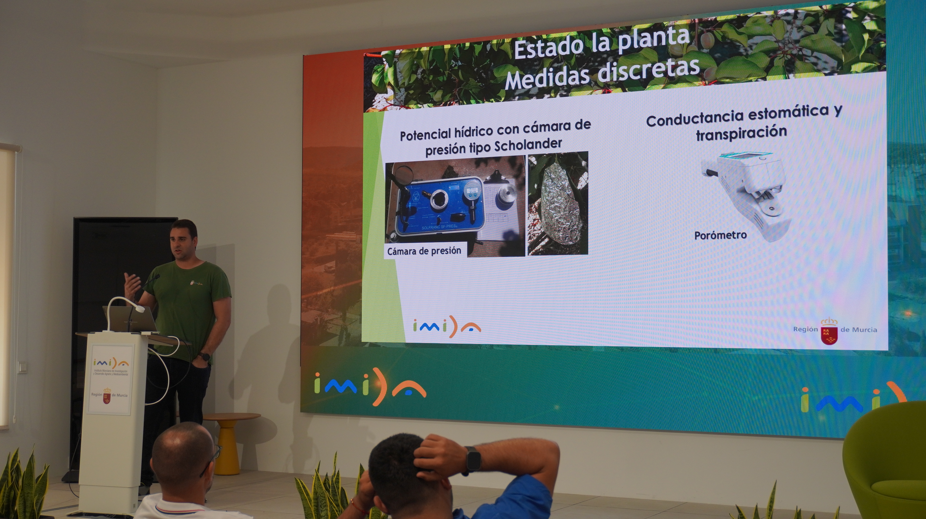 Han sido recibidos por el director del IMIDA, Andrés Martínez Bastida y posteriormente por el jefe de servicio OTRI, Antonio Aroca Martínez e investigadores de los equipos de Fruticultura y SIGyT (Alejandro Galindo y Manuel Erena), quienes les han explicado sus líneas relacionadas con la agricultura de precisión.
