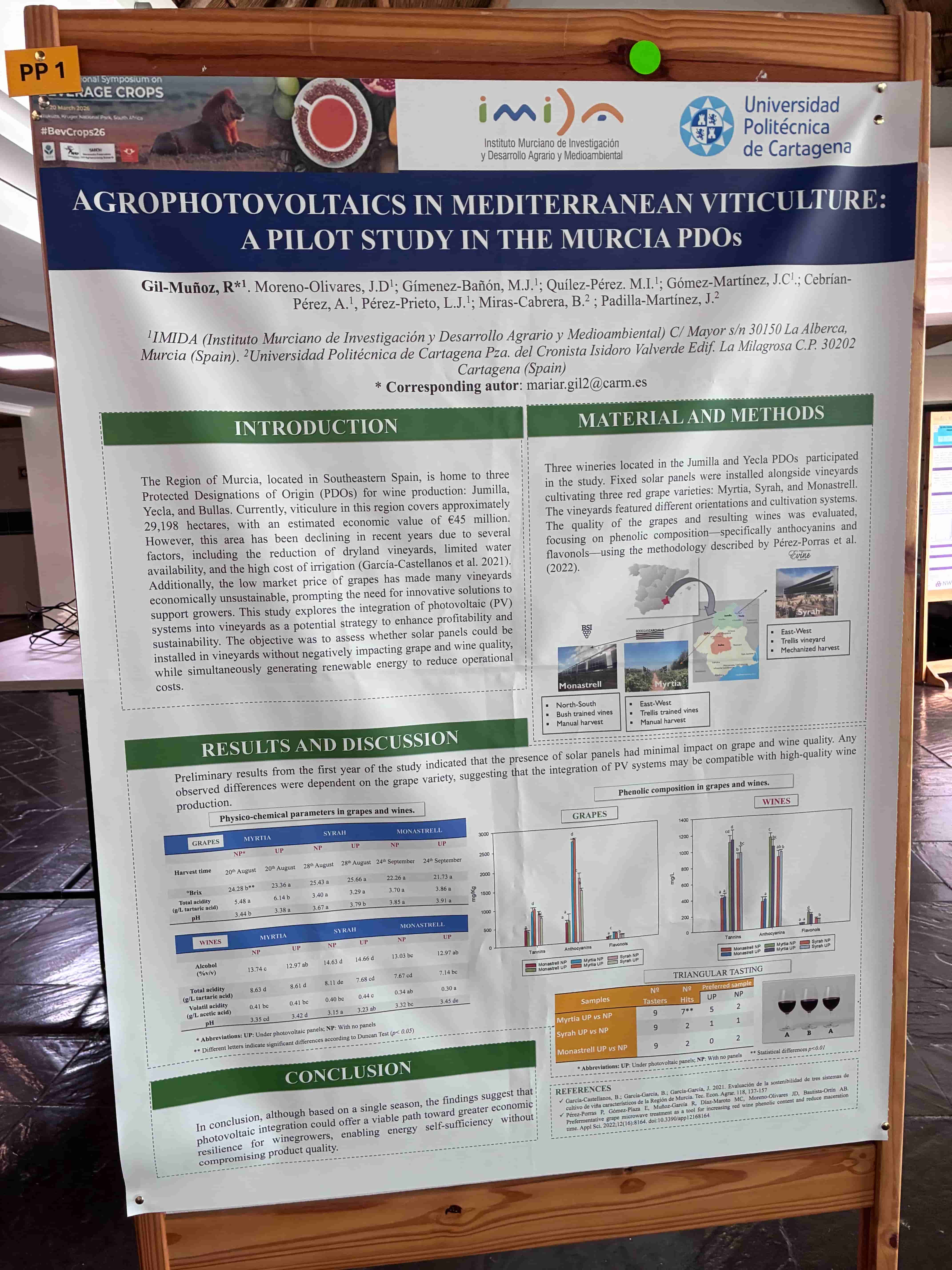 Por un lado, un póster que recoge un estudio pionero sobre el potencial de los sistemas agrovoltaicos aplicados a los viñedos mediterráneos de las Denominaciones de Origen de la Región de Murcia.